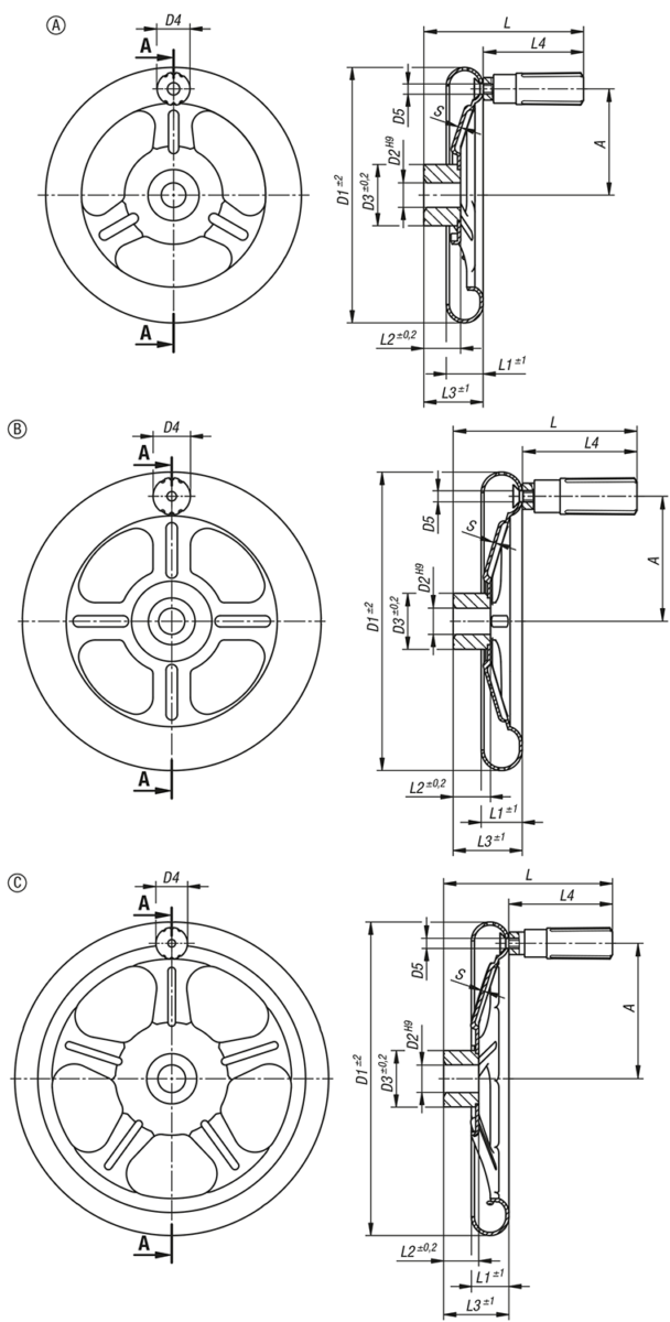 Spoked handwheels, sheet steel, with revolving cylinder grip