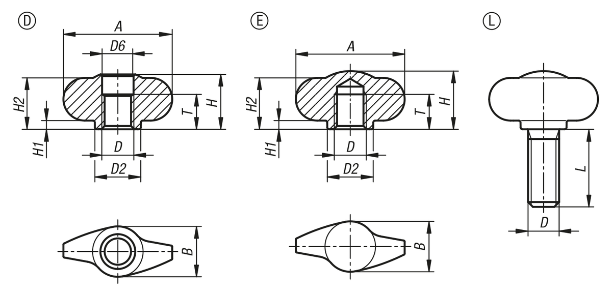 Objednací kód Základní cena bez DPH Objednat D T L Provedení Ocelový klíč Povrch základního tělesa A B D2 D6 H H1 H2 CAD