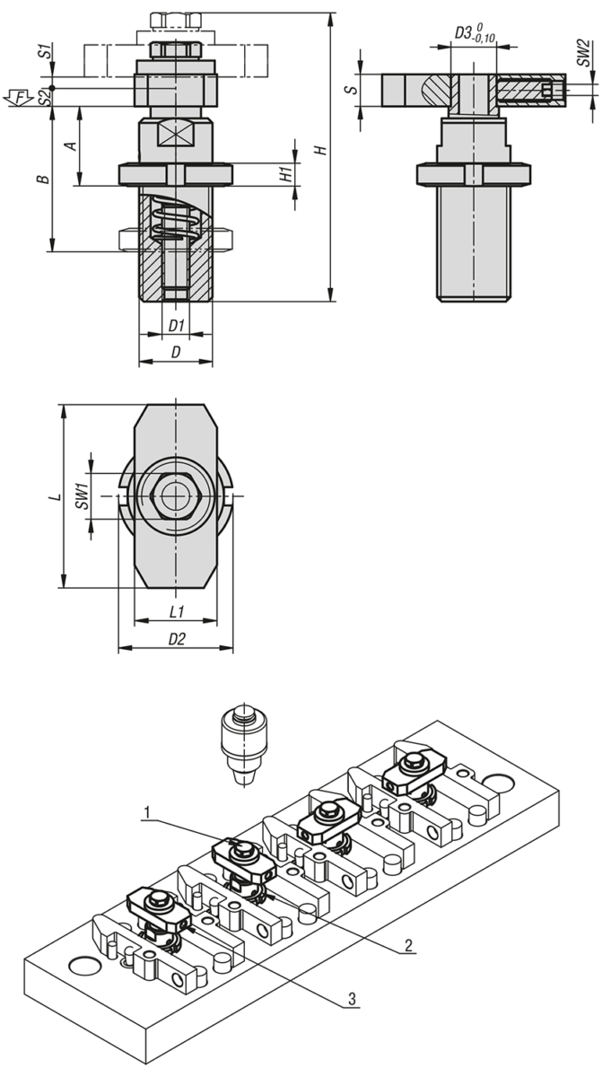 | Objednací kód | Základní cena bez DPH | Koncová cena s DPH | Objednat | CAD | D | F max. kN | D1 | D2 | D3 | A | B | H | H1 | L | L1 | S | S1 | S2 | SW1 | SW2 | Utahovací moment max. Nm |