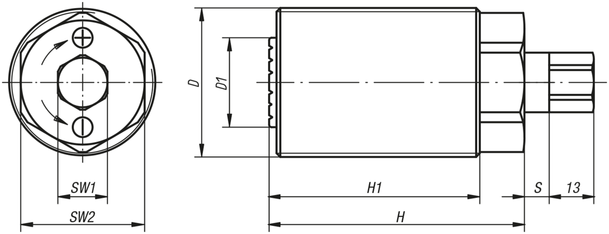 | Objednací kód | Základní cena bez DPH | Koncová cena s DPH | Objednat | CAD | D | Jmenovitá upínací síla kN | Max. upínací zdvih | D1 | H | H1 | S | SW1 | SW2 | Max. statické zatížení kN | Max. utahovací moment u vel. klíče 1 (Nm) |