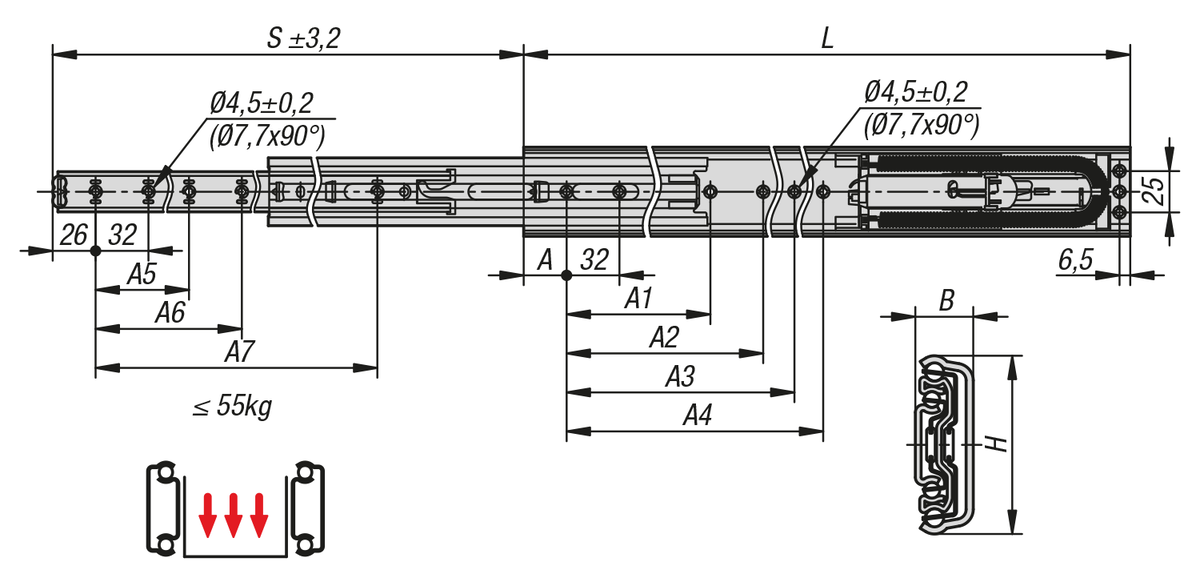 Datový list K2365 Teleskopické lišty, ocelové pro boční montáž, plný výsuv, nosnost do 55 kg