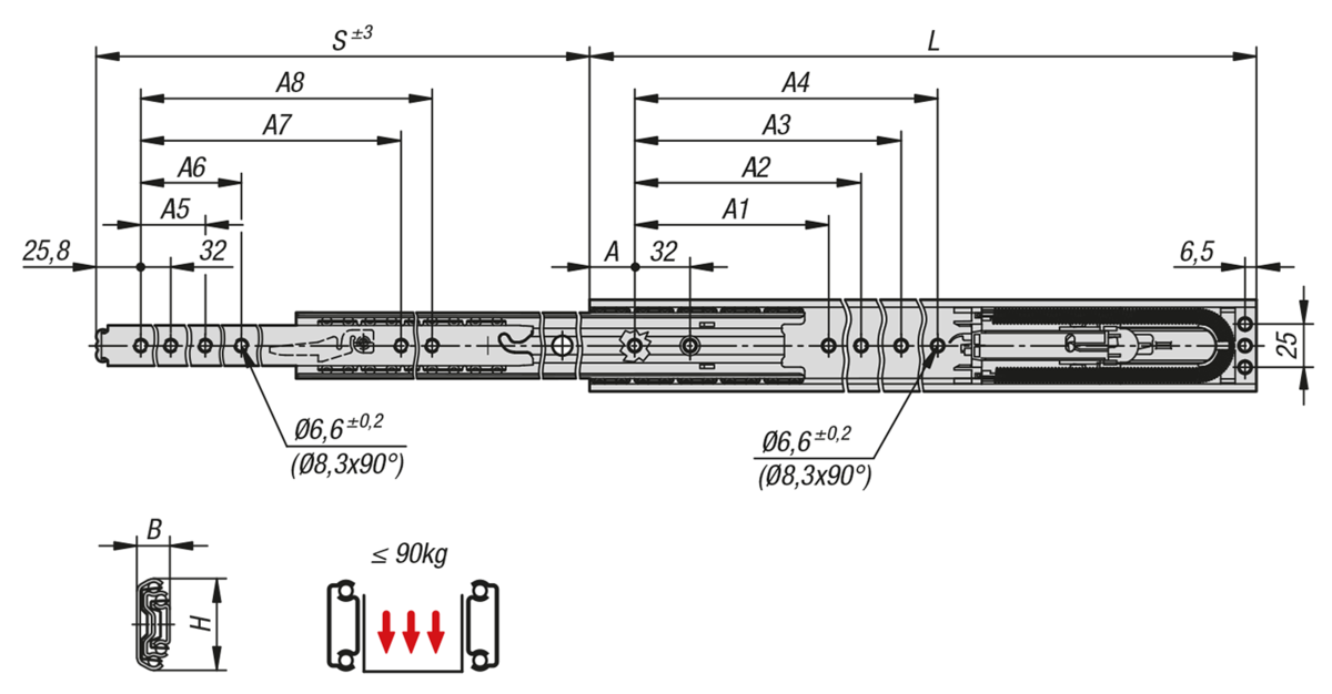 Datový list K2366 Teleskopické lišty, z nerezové oceli pro boční montáž, plný výsuv, nosnost do 90 kg