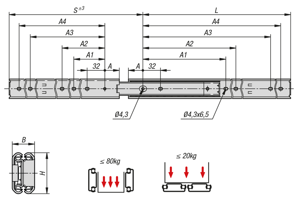 Datový list K2367 Teleskopické lišty, z nerezové oceli pro boční montáž, plný výsuv, nosnost do 80 kg