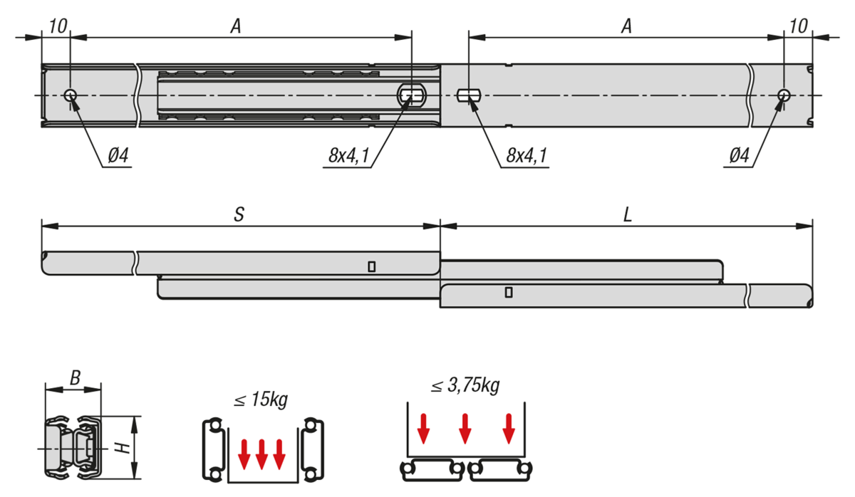 Teleskopické lišty, z nerezové oceli pro boční montáž, plný výsuv, nosnost do 15 kg