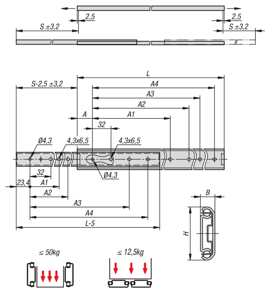 Datový list K2382 Teleskopické lišty ocelové pro boční montáž, částečné vysunutí, oboustranné, nosnost do 50 kg