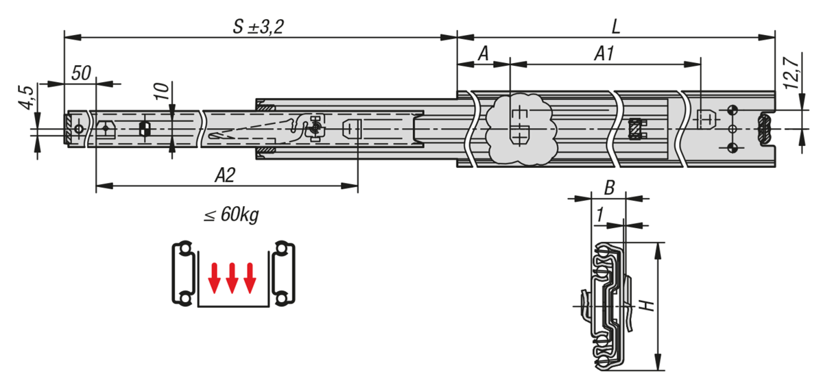 Datový list K2385 Teleskopické lišty, ocelové pro boční montáž, extra výsuv, nosnost do 60 kg