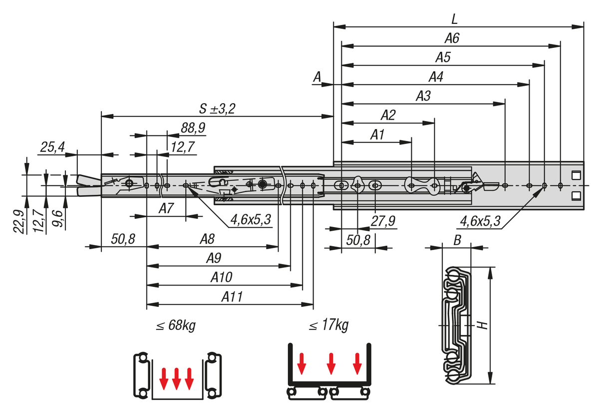 Datový list K2387 Teleskopické lišty, ocelové pro boční montáž, extra výsuv, nosnost do 68 kg