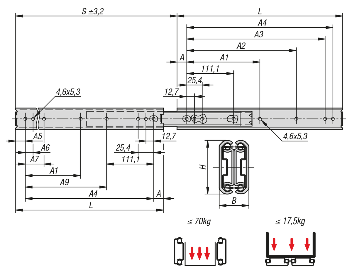Teleskopické lišty, ocelové pro boční montáž, extra výsuv, nosnost do 70 kg