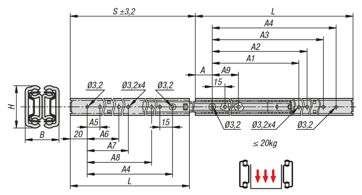 Datový list K2391 Teleskopické lišty, ocelové pro boční montáž, plný výsuv, nosnost do 20 kg