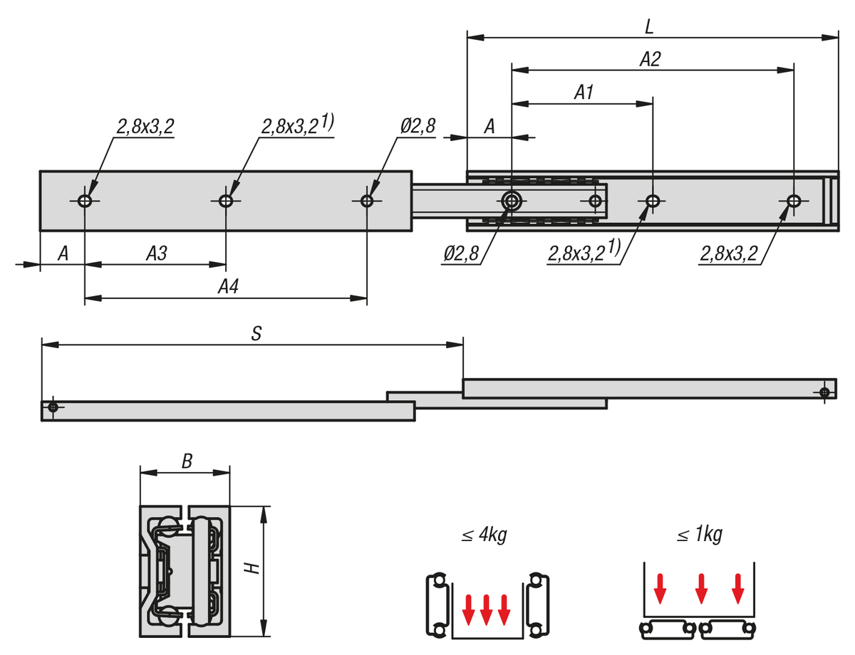 Datový list K2451 Teleskopické lišty, hliníkové, pro boční montáž, plný výsuv, nosnost do 4 kg