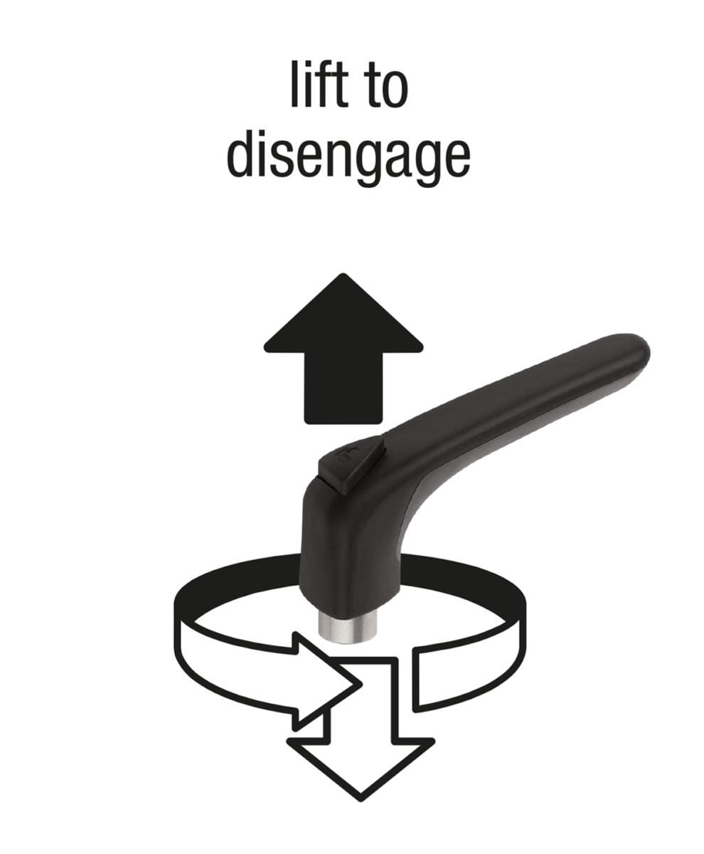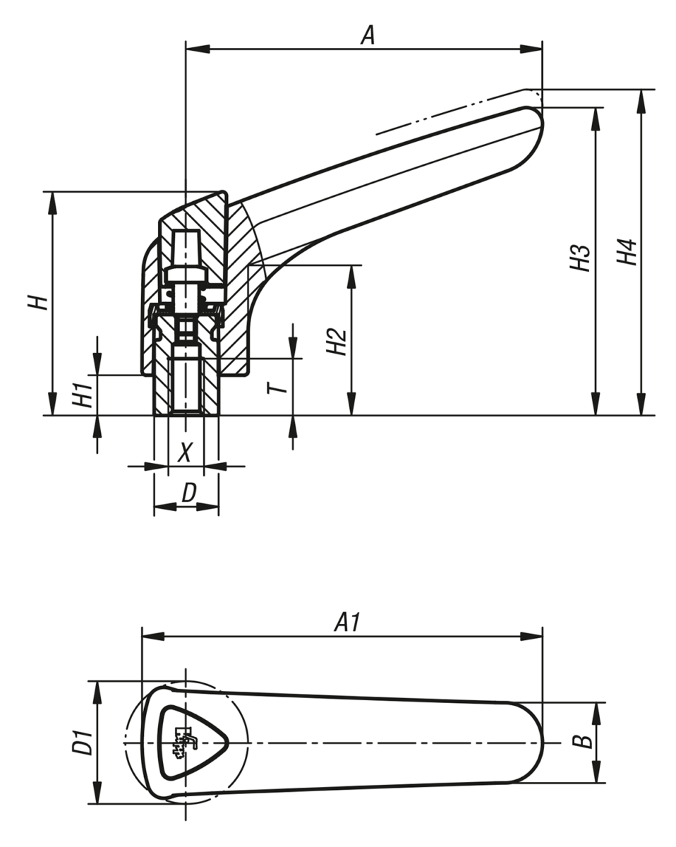 Dátový list norelem 06580 Upínacia páka z plastu, ergonomická, s vnútorným závitom, so závitovou vložkou z ocele, modro pasivovaná