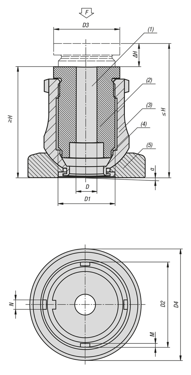 | Objednávací kód | Základná cena bez DPH | Objednať | H min. | H max. | D2 | D | D1 | D3 | D4 | ?H | M | N | F (kN) | α | pre skrutku | CAD |