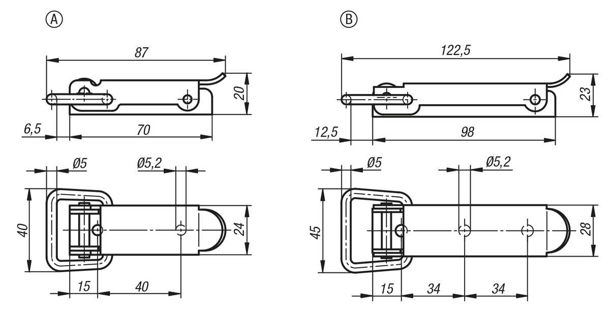 Datový list K2358 Upínací uzávěry z oceli nebo nerezové oceli, s upínacím úchytem, skryté otvory pro přišroubování
